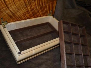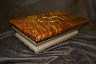 This Exotic Wood Custom Laser Engraved and Inlaid Jewelry Box to the right here is a perfect example of what we can do. This box started out as planks of raw wood and it now looks like this. It has a flamed Hawaiian Koa Top inlaid with tiger maple interlocking hearts and a tiger maple body with two custom walnut, suede padded trays.